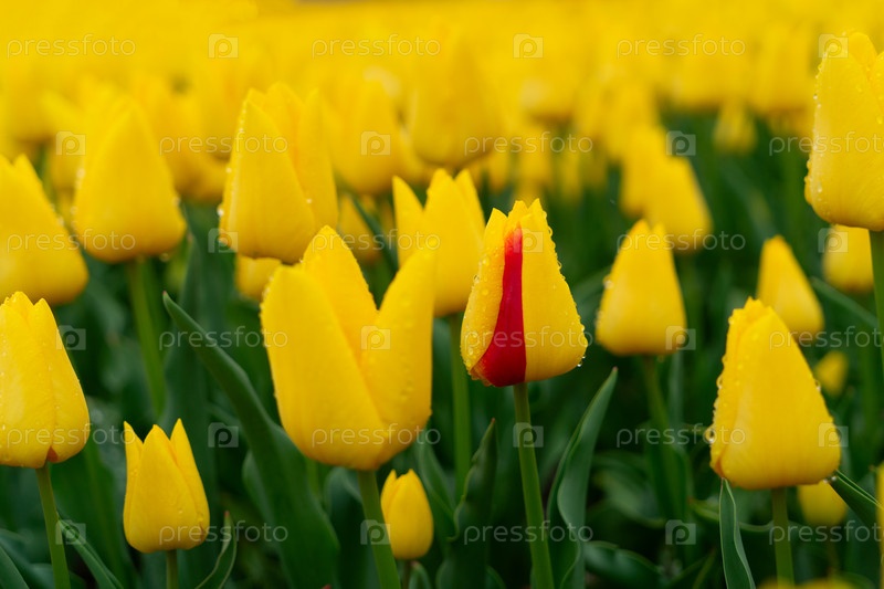 Известное голландское темно-желтое тюльпаново поле с рядами в солнечный день с голубым небом