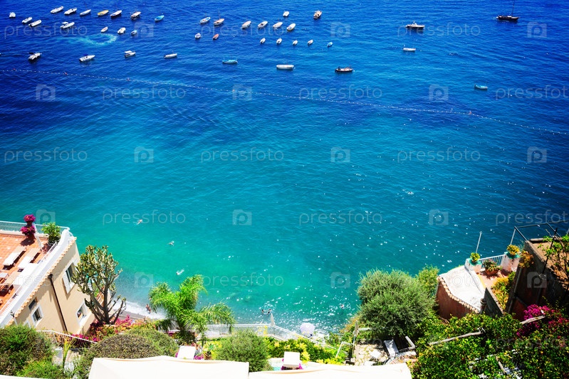 Воды Тирренского моря с лодками, вид из воздуха , побережье Амальфи Италия, ретро-тон
