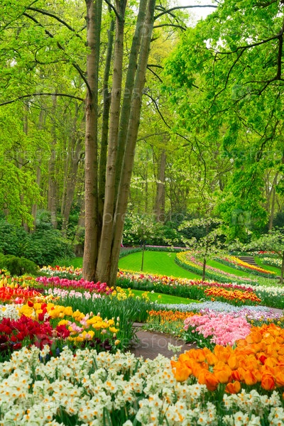 Красочный путь в саду тюльпанов, демонстрирующий яркие цветы в пышной обстановке, приглашает посетителей исследовать