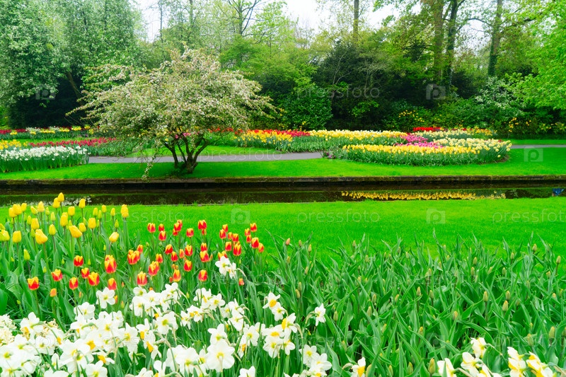 Красочный путь в саду тюльпанов, демонстрирующий яркие цветы в пышной обстановке, приглашает посетителей исследовать
