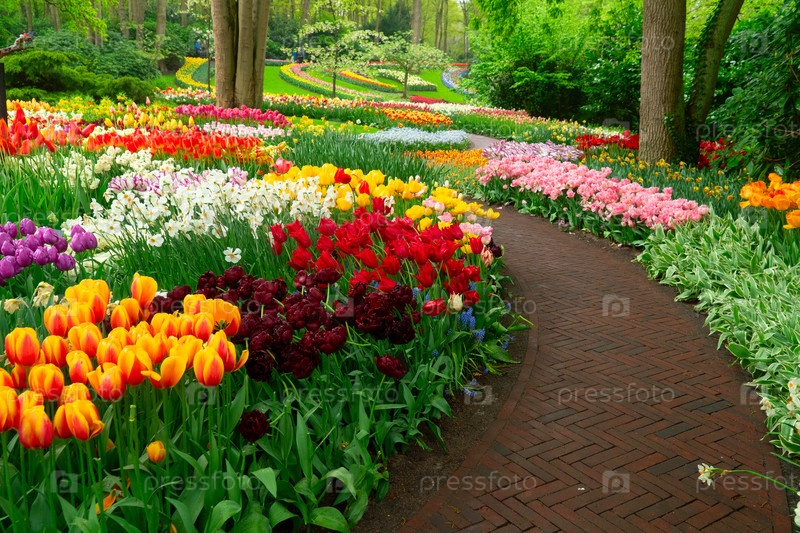 Красочный путь в саду тюльпанов, демонстрирующий яркие цветы в пышной обстановке, приглашает посетителей исследовать