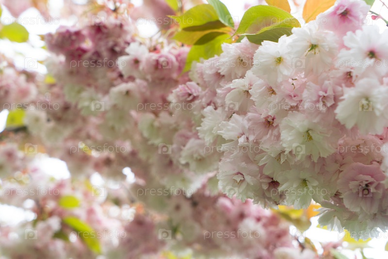 Розовый цвет вишневого цветка на близком расстоянии показывает деликатные скопленные лепестки против мягкого боке, нежный весенний свет фильтрует через тонкие ветви, пастельные тона и спокойствие