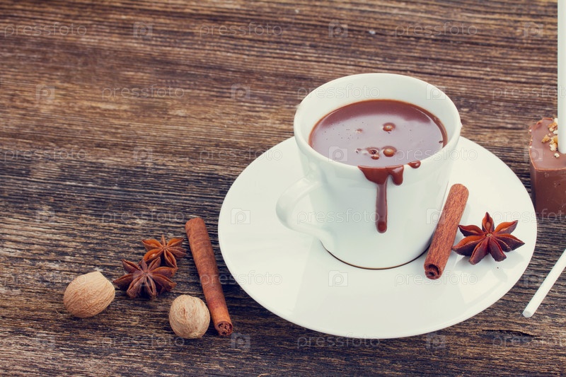 Белый стакан с горячим шоколадом и зефиром на деревянном столе, цвет года 2025 мока мусс