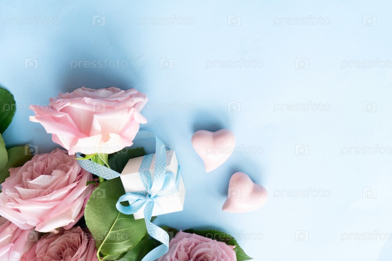 Цветущий розовый букет цветов роз с коробкой для подарков, фон на День святого Валентина