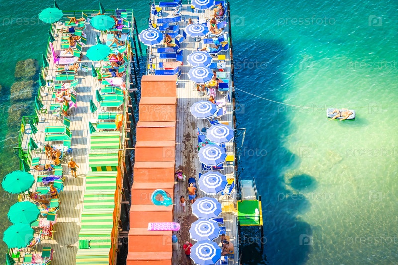Вид на курортный город Сорренто сверху, пляж южной Италии