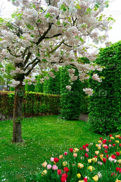 Красочная ландшафтная обстановка на открытом воздухе. пышный сад с цветущими цветами и яркими цветами. красивое наружное пространство, в котором растут цветущие деревья и яркие клумбы тюльпанов