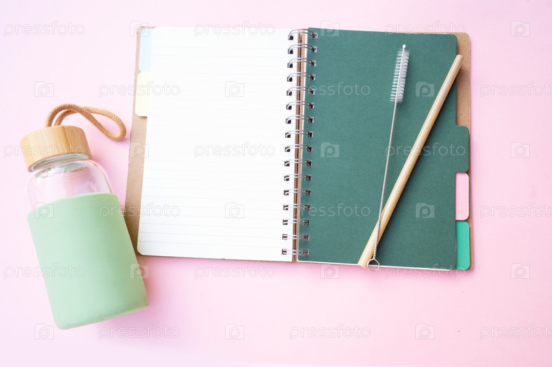 Концепция нулевых отходов, многоразовое использование экологически чистой соломы и бутылки для воды на розовом фоне с копировальным пространством