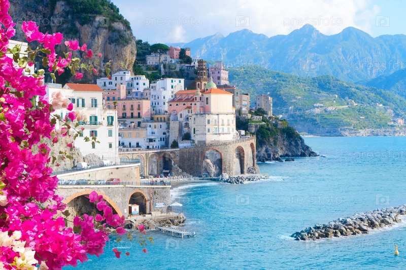 Летнее побережье Амальфи и Тирренское море с лодками, Италия