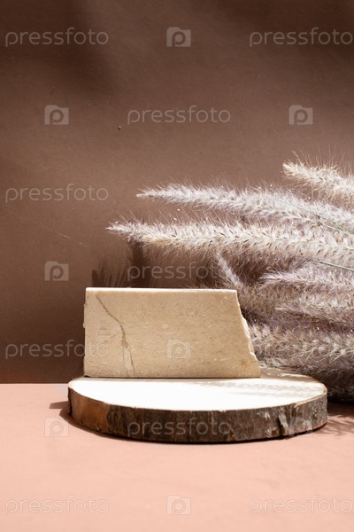 Сцена акций в стиле травы в богатых коричневых тонах земли, экранирование на подиуме из травертина с копировальным пространством, цвет 2025 года мока-мусс