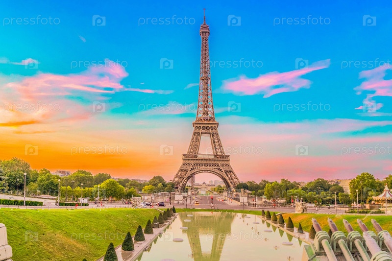 Эйфелева башня и сад Трокадеро на закате в Париже, Франция.Эйфелевая башня - одна из самых знаковых достопримечательностей Парижа