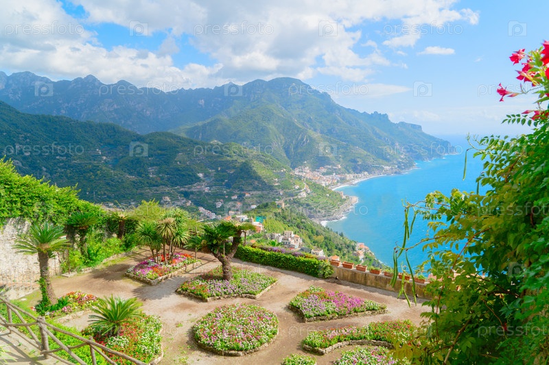 Деревня Равельо с церквями над морем, побережье Амальфи в Италии
