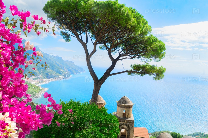 Деревня Равельо с церквями над морем, побережье Амальфи в Италии
