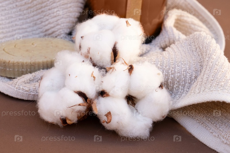 Хлопковые бутоны на коричневых земляных тонах фона, цвет года 2025 мока мусс