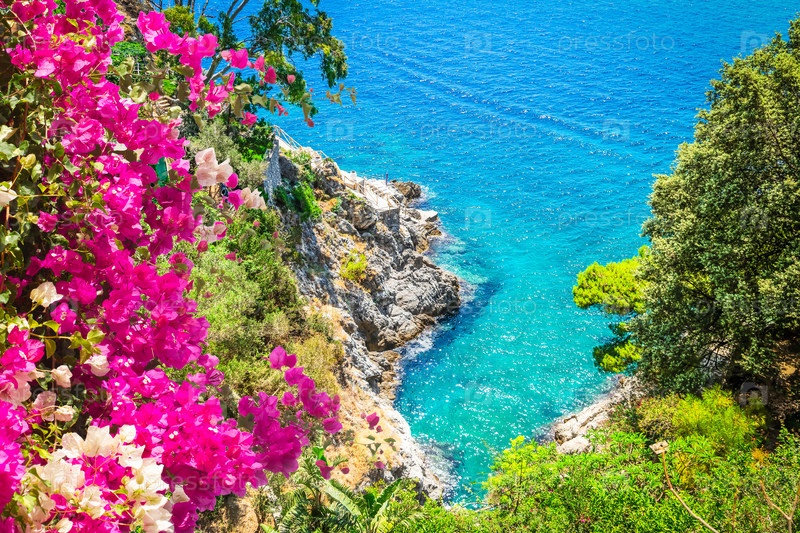 Вид с воздуха на побережье Тирренского моря, берег Амальфитаны в Италии