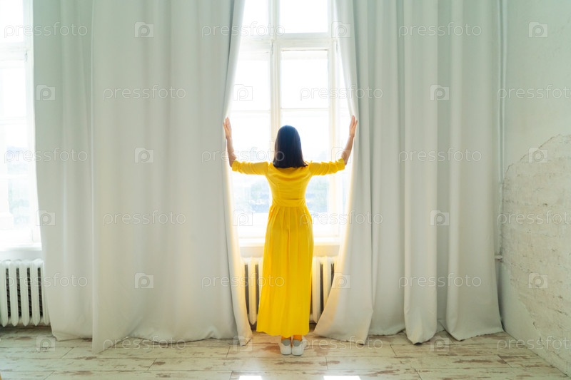 Улыбающаяся женщина в ярком желтом платье грациозно позирует рядом со солнечным окном, излучая тепло и чистую радость