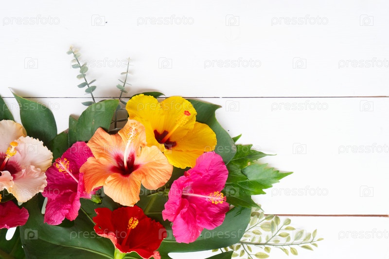 Тропические цветы и листья на деревянном фоне с копировальным пространством, фон летних каникул