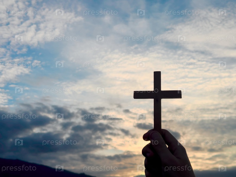 Христианская молитва: мужчина или женщина с крестом в руках, закат на заднем плане