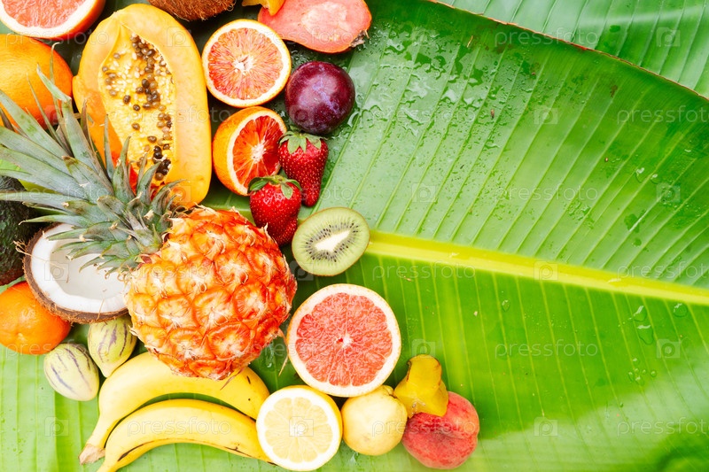 Летняя смесь тропических фруктов над зелеными листьями