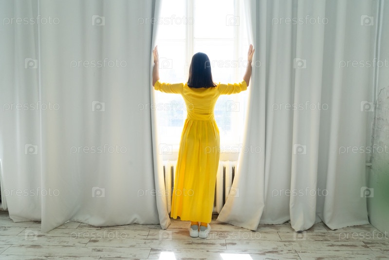 Улыбающаяся женщина в ярком желтом платье грациозно позирует рядом со солнечным окном, излучая тепло и чистую радость
