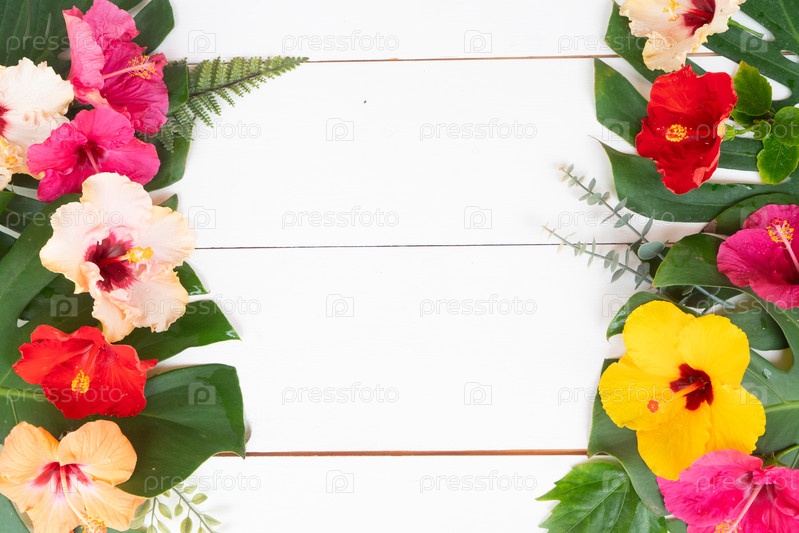 Тропические цветы и листья на деревянном фоне, фон летних каникул