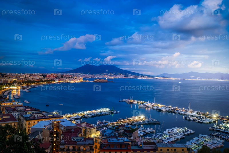 Панорамный городской пейзаж Неаполь с вулканом Везувий ночью, Италия