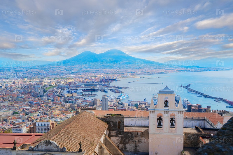 Панорамный городской пейзаж Неаполя с вулканом Везувий на закате, Италия