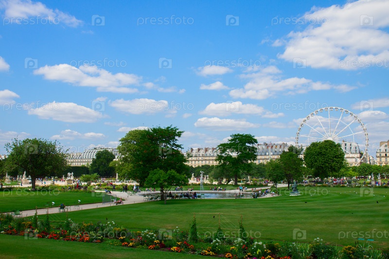 Сад Туилри в летний день, зеленая лужайка и голубое небо с облаками, Париж Франция