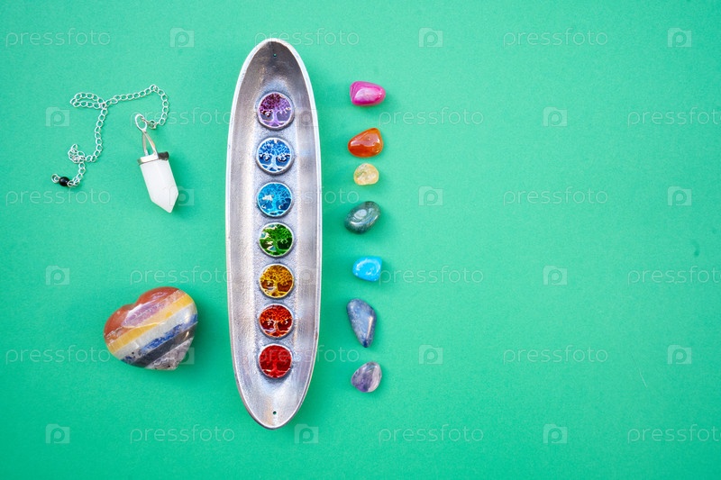 Семь чакр камней на зеленом фоне с копировальным пространством