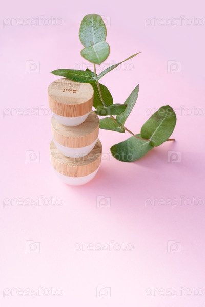 Концепция натуральной косметики, кружки с кремом на мягком розовом фоне