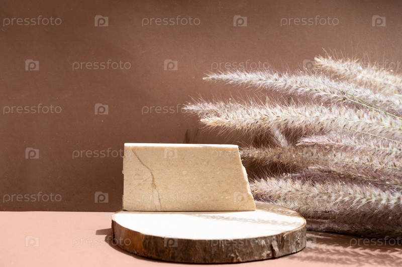 Сухая трава в стиле фоновой сцены в коричневых тонах земли, травертиновый подиумный дисплей с копировальным пространством, цвет года 2025 mocha mousse