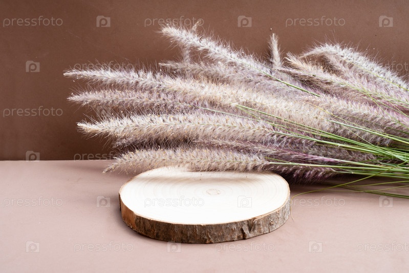 Сцена в стиле сухой травы в коричневых тонах земли, деревянный подиум с копировальным пространством, цвет года 2025 mocha mousse