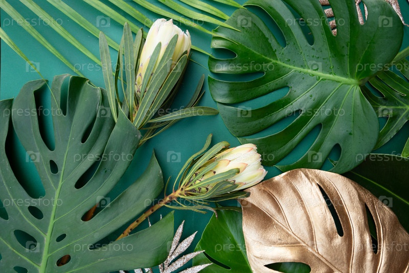 Тропические листья и цветы на зеленом фоне, летний фон, вид сверху