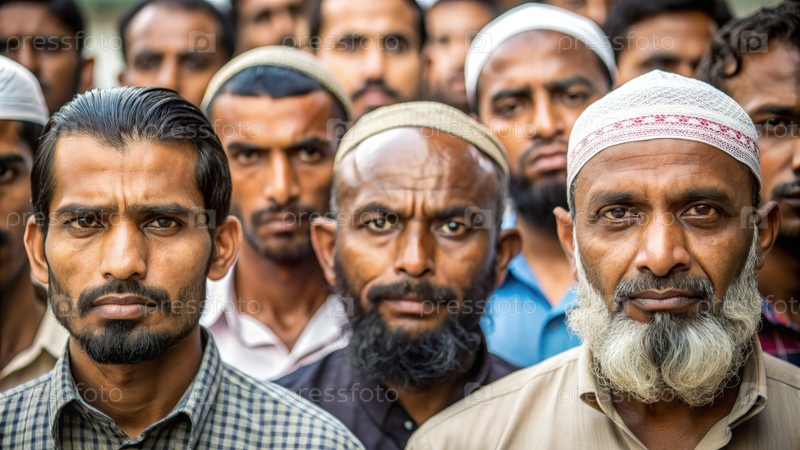 Мусульманские мужчины, обращенные к камере в переполненной среде днем. генеративная группа ИИ