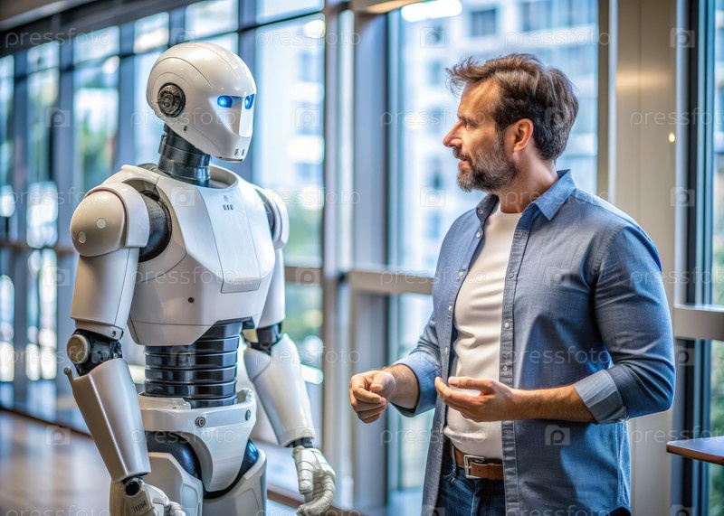Человек ведет разговор с гуманоидным роботом в современной офисной обстановке