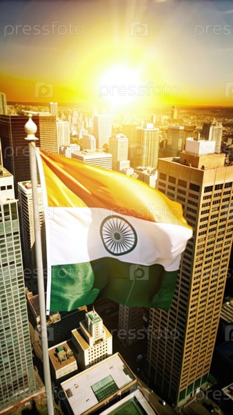 Вид с воздуха яркого городского пейзажа на закате, где размахивает индийским флагом