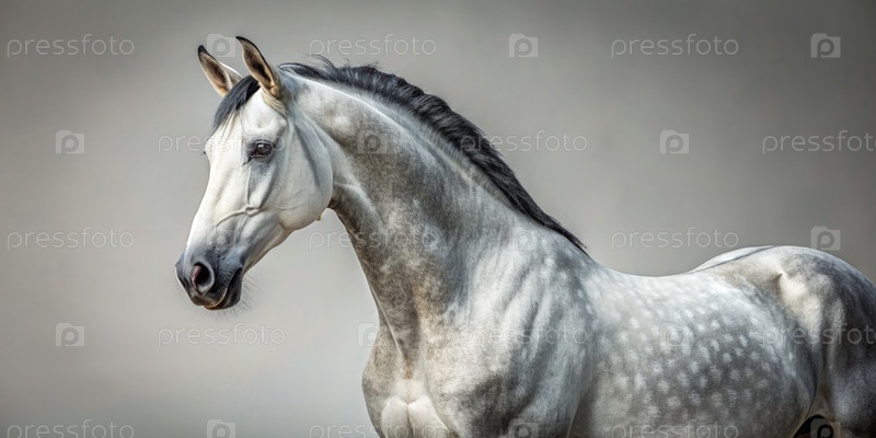 Сильный серый спортивный конь в профессиональной фотосессии на нейтральном фоне