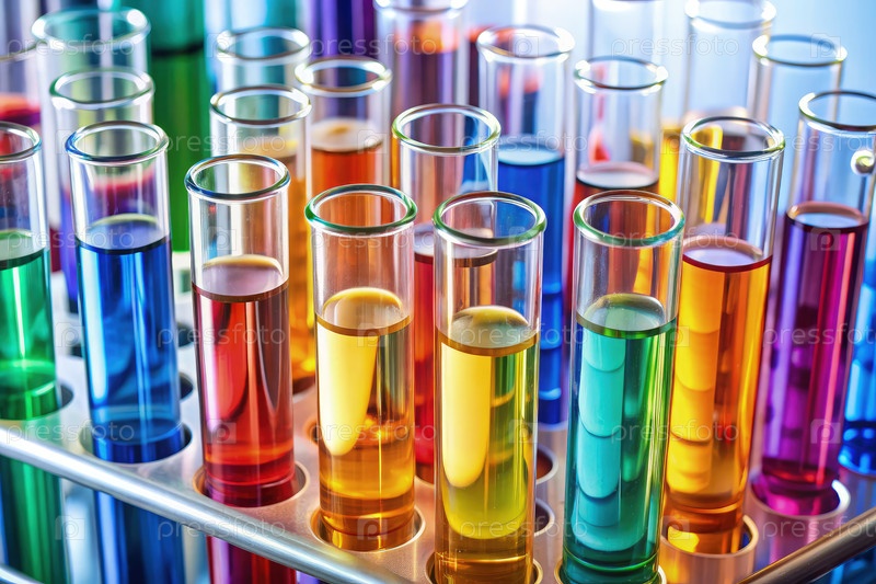 Массив ярко окрашенных пробирков, отображающих различные жидкости в лабораторной обстановке