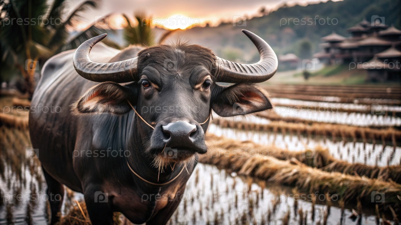 Величественный буйвол стоит на пышном рисовом поле при закате, олицетворяя мирную сельскохозяйственную жизнь в сельских ландшафтах