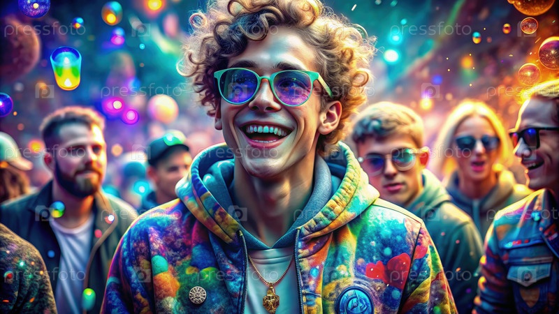 Веселый человек наслаждается красочным фестивальным опытом с друзьями в яркую ночь