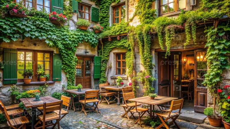 Charming Inn Courtyard With Cornered Table Covered in Lush Vine Plants at Dusk. - Очаровательное дворовое заведение с угловым столом, покрытым пышными виноградниками на закате