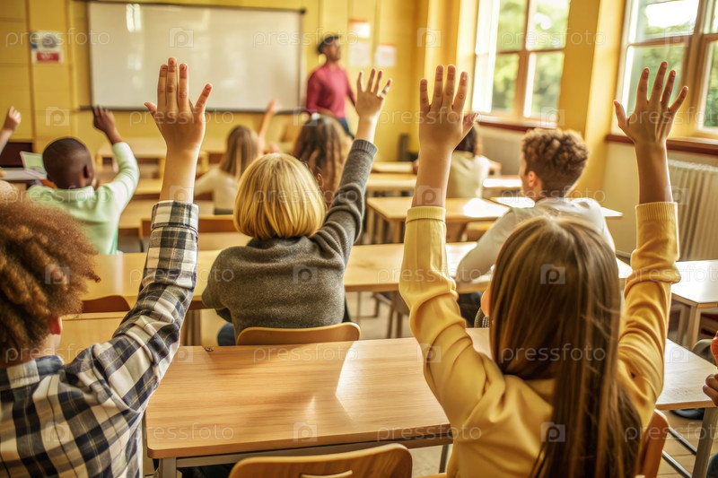 Студенты, участвующие в классовой дискуссии с поднятой рукой во время урока