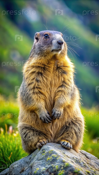 Сурка, стоящая на скале в пышном горном пейзаже днем