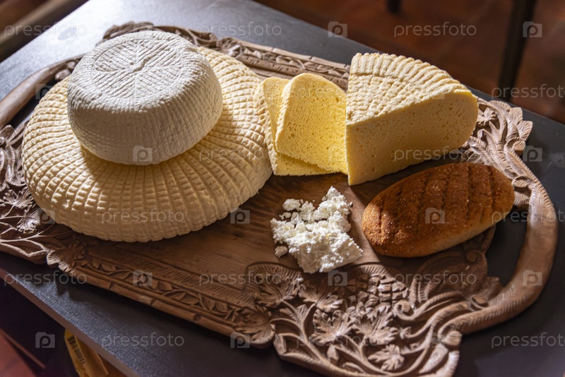Привлекательная композиция из различных сыров ручной работы, выложенных на деревянном блюде красивой работы. На сцене представлены различные виды сыра, в том числе круглый белый сыр, сыр в желтых кубиках большего размера, ломтики сыра и свежая сырная крош