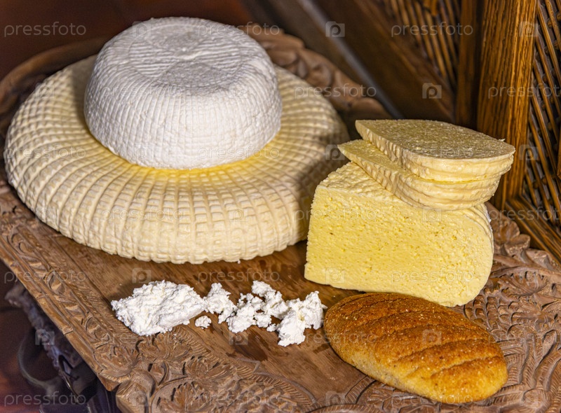 Визуально привлекательная композиция из различных сыров ручной работы, выложенных на деревянном блюде красивой работы. На сцене представлены различные виды сыра, в том числе круглый белый сыр, сыр в желтых кубиках большего размера, ломтики сыра и свежая с
