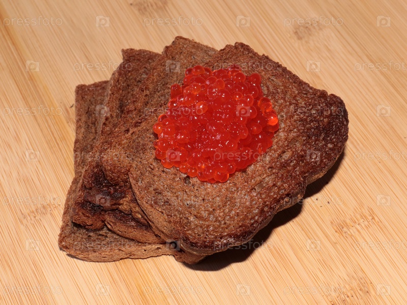 Кучу красной лососевой икры на флейте пшеничного хлеба на завтрак