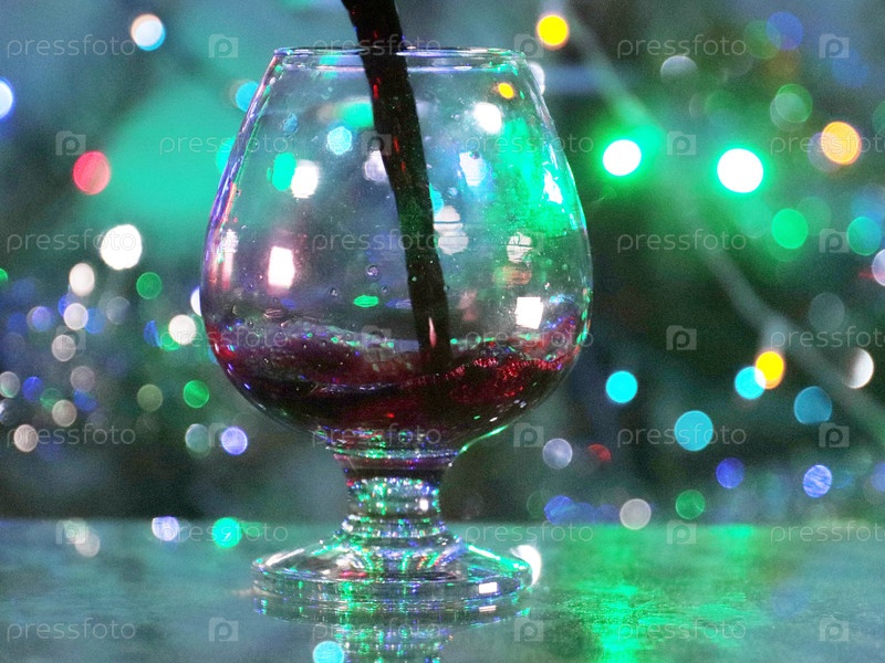 Струя красного вина, когда она наливается в стакан на праздничном фоне