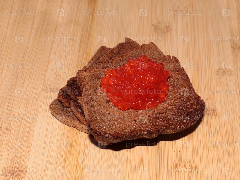 Кучу красной лососевой икры на флейте пшеничного хлеба на завтрак