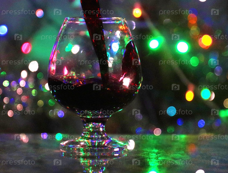 Струя красного вина, когда она наливается в стакан на праздничном фоне