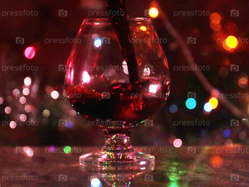 Струя красного вина, когда она наливается в стакан на праздничном фоне