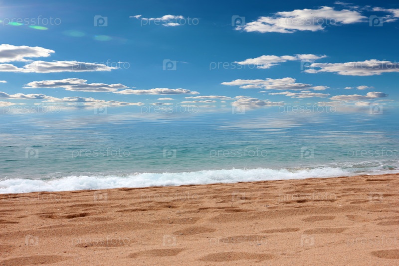 Красивый песчаный пляж и солнечное небо как место для активного отдыха
